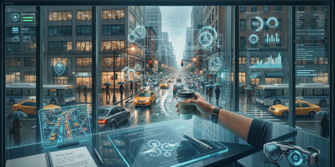 A chuva batia na janela com uma cadência que, de certa forma, imitava o tique-taque de um relógio. Da minha cadeira, eu observava a rua lá embaixo: o fluxo contínuo de carros, os semáforos alternando suas cores com precisão milimétrica, os guarda-chuvas que se abriam quase em uníssono ao primeiro sinal do temporal. A mente, sempre tão viciada na concretude do mundo, logo sussurrou a palavra óbvia: máquinas. É muito fácil olhar para o nosso tempo e culpar o aço, o silício e os motores. Crescemos condicionados a acreditar que a tecnologia é aquele objeto frio que repousa sobre a mesa ou a estrutura maciça que cospe fumaça no horizonte.…